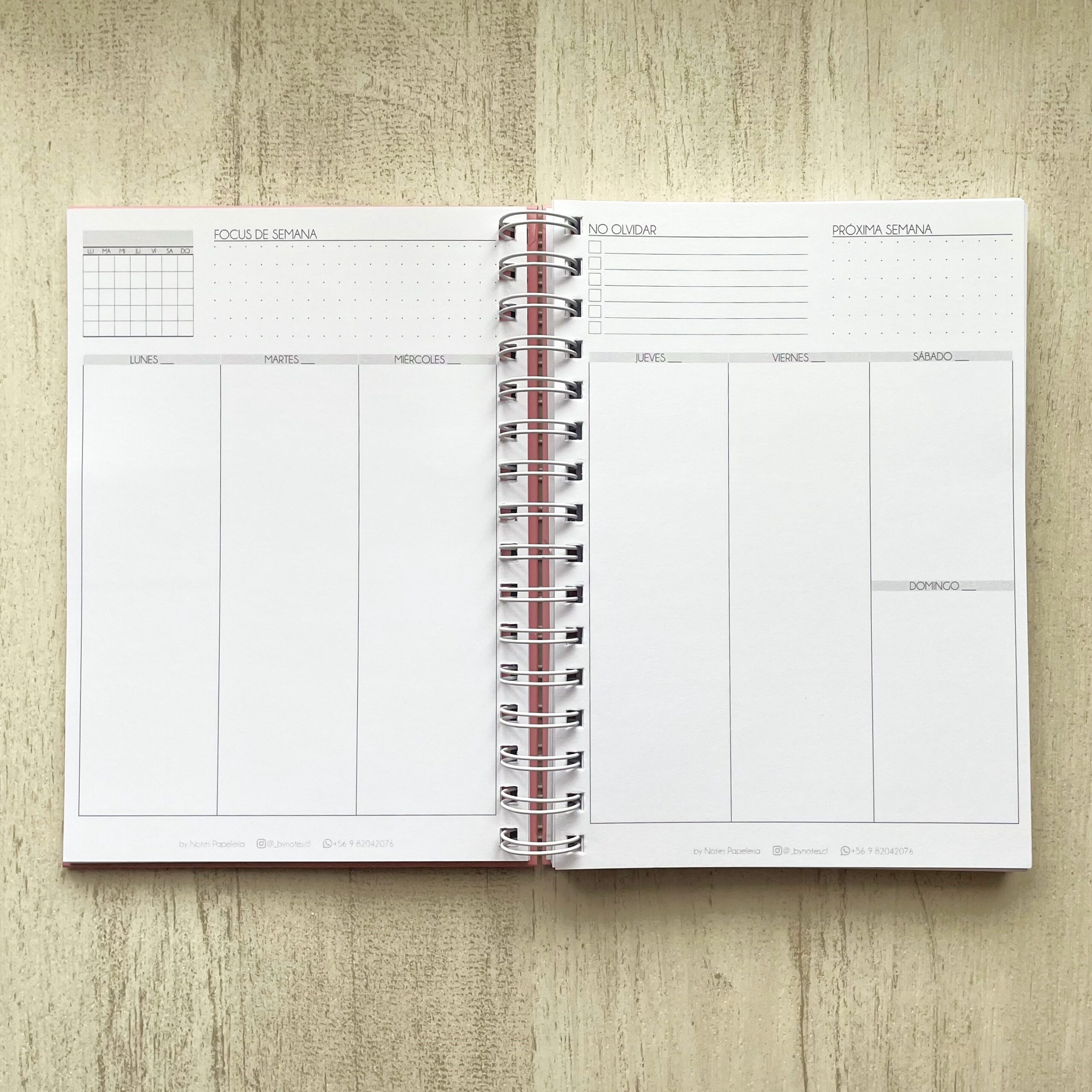 • ︎Vista semanal en dos páginas continuas con calendario mensual, «Focus semana», check list «No olvidar» «Semana siguiente».